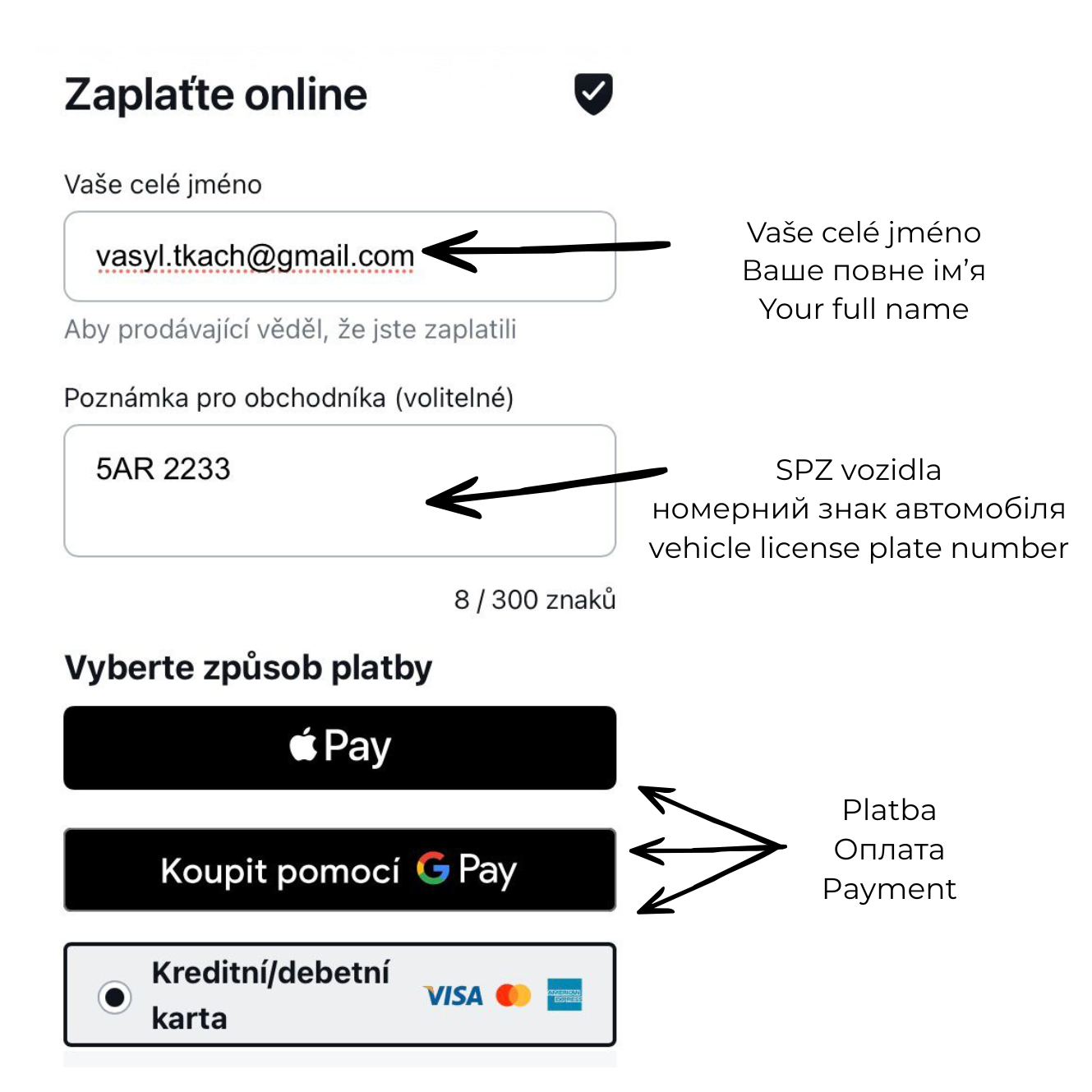 3. VYPLŇTE SVÉ JMÉNO A SPZ VOZIDLA / ENTER YOUR NAME AND VEHICLE PLATE NUMBER / Введіть ваше ім'я та номер автомобіля